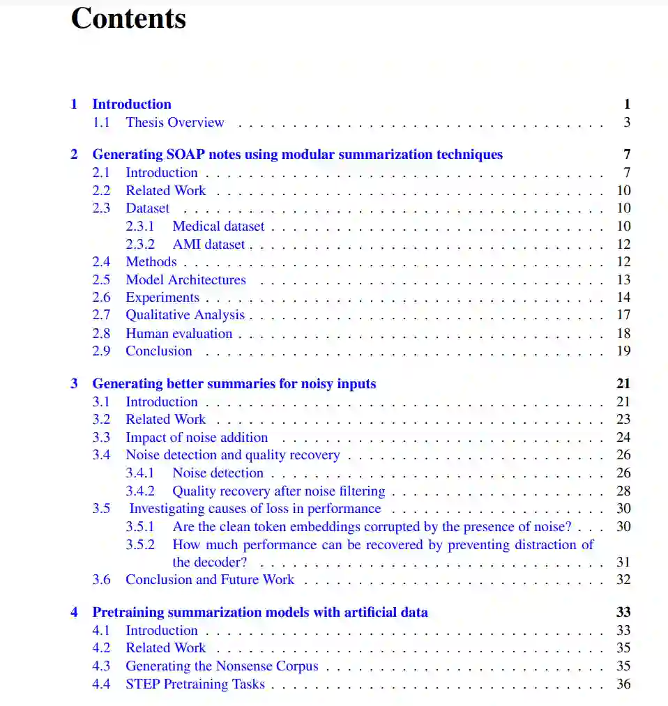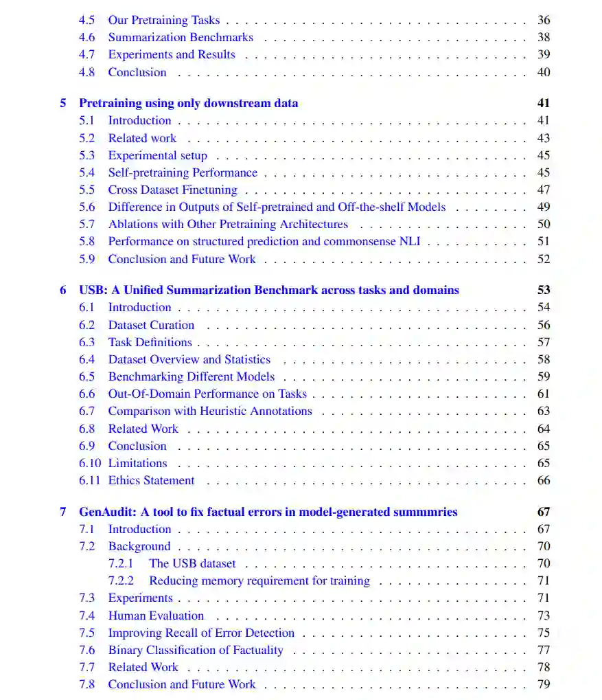 在本文中,我们提供了解决上述摘要模型问题的方法和资源。在第一部分中,我们提出了为具有挑战性特征的输入(如长对话或噪声文档)生成高质量摘要的方法。我们引入了一种模块化摘要生成管道来处理长序列,生成更好且更符合事实的摘要。然后,我们描述了输入噪音对摘要模型的影响,并设计了轻量级探测器来检测和消除噪音。在第二部分中,我们介绍了无需使用任何上游预训练文本语料库的预训练方法,但仍能实现大部分预训练对大型网络语料库的性能提升。提出的方法包括人工创建预训练语料库,并重复利用下游训练样本中的未标注文本进行预训练。此部分揭示了预训练带来的大部分性能提升归因于某种未知机制,而不是来自大规模外部预训练语料库的知识转移。在第三部分,也是最后一部分中,我们设计了验证大型语言模型生成摘要并检测其中潜在事实错误的方法。我们创建了一个公共基准数据集,用于训练和评估对事实核查摘要有用的多任务模型。然后,我们设计了一个交互工具,帮助用户将大型语言模型生成的摘要与参考文档进行核对,并展示了其在突出显示多种大型语言模型对不同领域文档生成的错误方面的有效性。