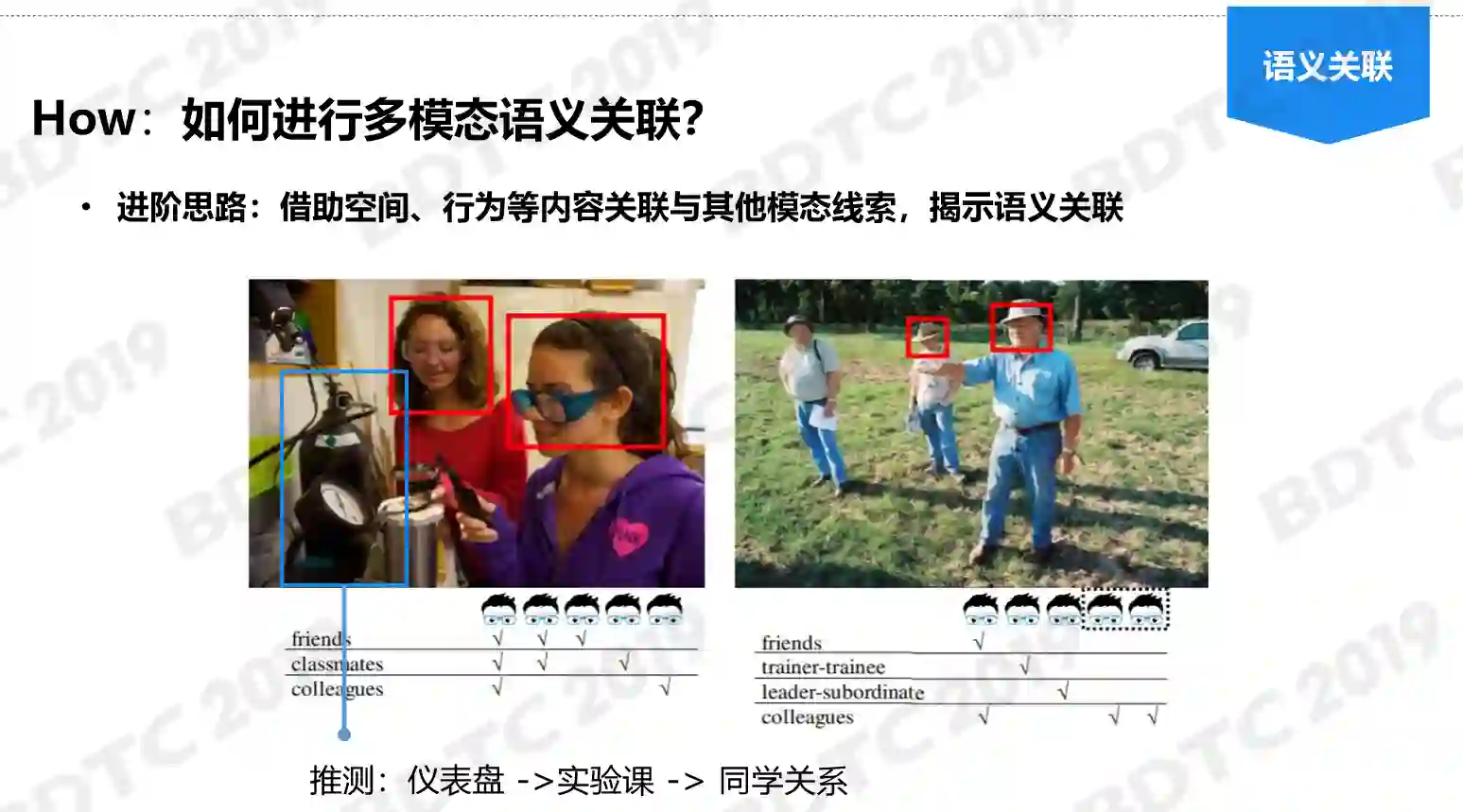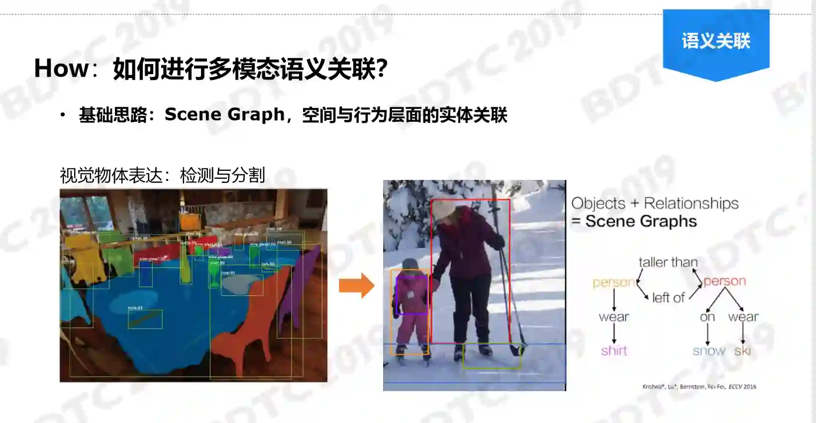 然而获取语义信息存在极大的挑战,从理论层面来说,机器不理解人的思维方式,这样会导致“语义鸿沟”的现象;数据层面,缺乏规范化标注语料,各模态信息难以解释与关联。因此本教程中提出通过融模态语义理解和多模态语义关联来加深层次语义理解。