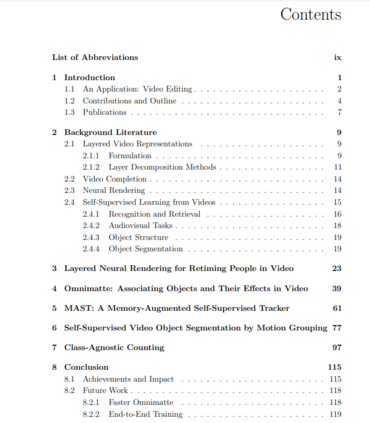 为了将物体与其相关的视觉效果自动分组,我们采用了一种分层的方法:我们的目标是将视频分解成特定的物体层,其中包含所有与物体一起移动的元素。这些层的一个应用是,它们可以以新的方式重新组合,以产生一个高度真实的、经过改变的原始视频版本(例如,删除或复制物体,或改变其运动的时间)。这里的关键是利用卷积神经网络的自然属性来获得输入视频的分层分解。我们设计了一个神经网络,通过对视频的过度拟合,为视频输出层。我们首先介绍了一种针对人类的方法,然后展示了如何将其适应于任意的物体类别,如动物或汽车。我们的第二个任务是视频物体分割:为视频中的物体产生像素级的标签(段)。我们以前的工作是在单个视频上进行优化,而在这里,我们采取了一种数据驱动的方法,以自我监督的方式对大量的视频语料库进行训练。我们考虑了两种不同的任务设置:(1)半监督物体分割,即为单一帧提供初始物体掩码,该方法必须将该掩码传播到其余帧;(2)移动物体发现,即不提供掩码,该方法必须分割突出的移动物体。我们探讨了两种不同的输入流。RGB和光流,并讨论它们与人类视觉系统的联系。