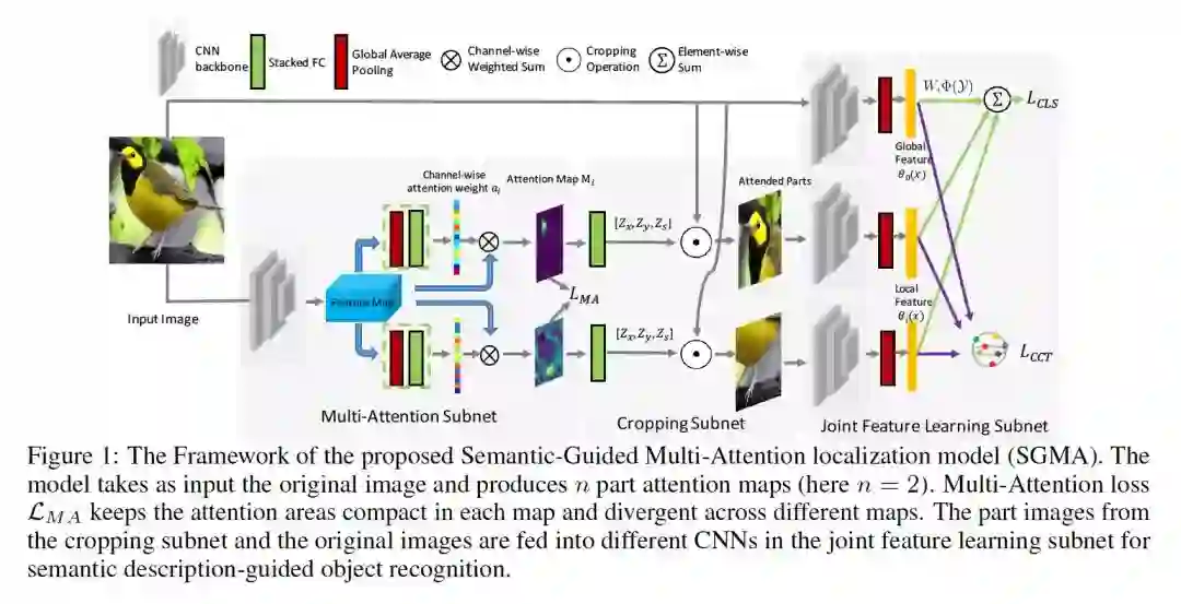 摘要:零样本学习(Zero-shot learning)通过引入类的语义表示,将传统的目标分类扩展到不可见的类识别。现有的方法主要侧重于学习视觉语义嵌入的映射函数,而忽视了学习discriminative视觉特征的效果。本文研究了discriminative region localization的意义。提出了一种基于语义引导的多注意力定位模型,该模型能自动发现目标中最discriminative的部分,实现零样本学习,不需要人工标注。我们的模型从整个目标和被检测部分共同学习协作的全局和局部特征,根据语义描述对对象进行分类。此外,在嵌入softmax loss和class-center triplet loss的联合监督下,鼓励模型学习具有高类间离散性和类内紧凑性的特征。通过对三种广泛使用的零样本学习基准的综合实验,我们证明了multi-attention localization的有效性,我们提出的方法在很大程度上改进了最先进的结果。