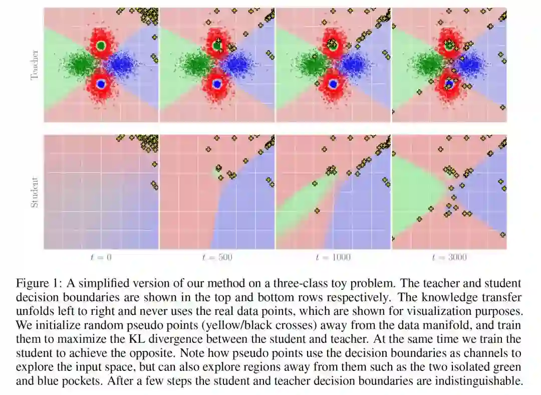 摘要:在现代深度学习应用中,将知识从一个大的teacher network迁移到一个小的student network中是一个很受欢迎的任务。然而,由于数据集的规模越来越大,隐私法规也越来越严格,越来越多的人无法访问用于训练teacher network的数据。我们提出一种新方法,训练student network在不使用任何数据或元数据的情况下,与teacher network的预测相匹配。我们通过训练一个对抗生成器来搜索student与teacher匹配不佳的图片,然后使用它们来训练student,从而达到这个目的。我们得到的student在SVHN这样的简单数据集上与teacher非常接近,而在CIFAR10上,尽管没有使用数据,我们在few-shot distillation (100 images per class)的技术水平上进行了改进。最后,我们还提出了一种度量标准,来量化teacher与student在决策边界附近的信念匹配程度,并观察到我们的zero-shot student与teacher之间的匹配程度显著高于用真实数据提取的student与teacher之间的匹配程度。我们的代码链接如下: