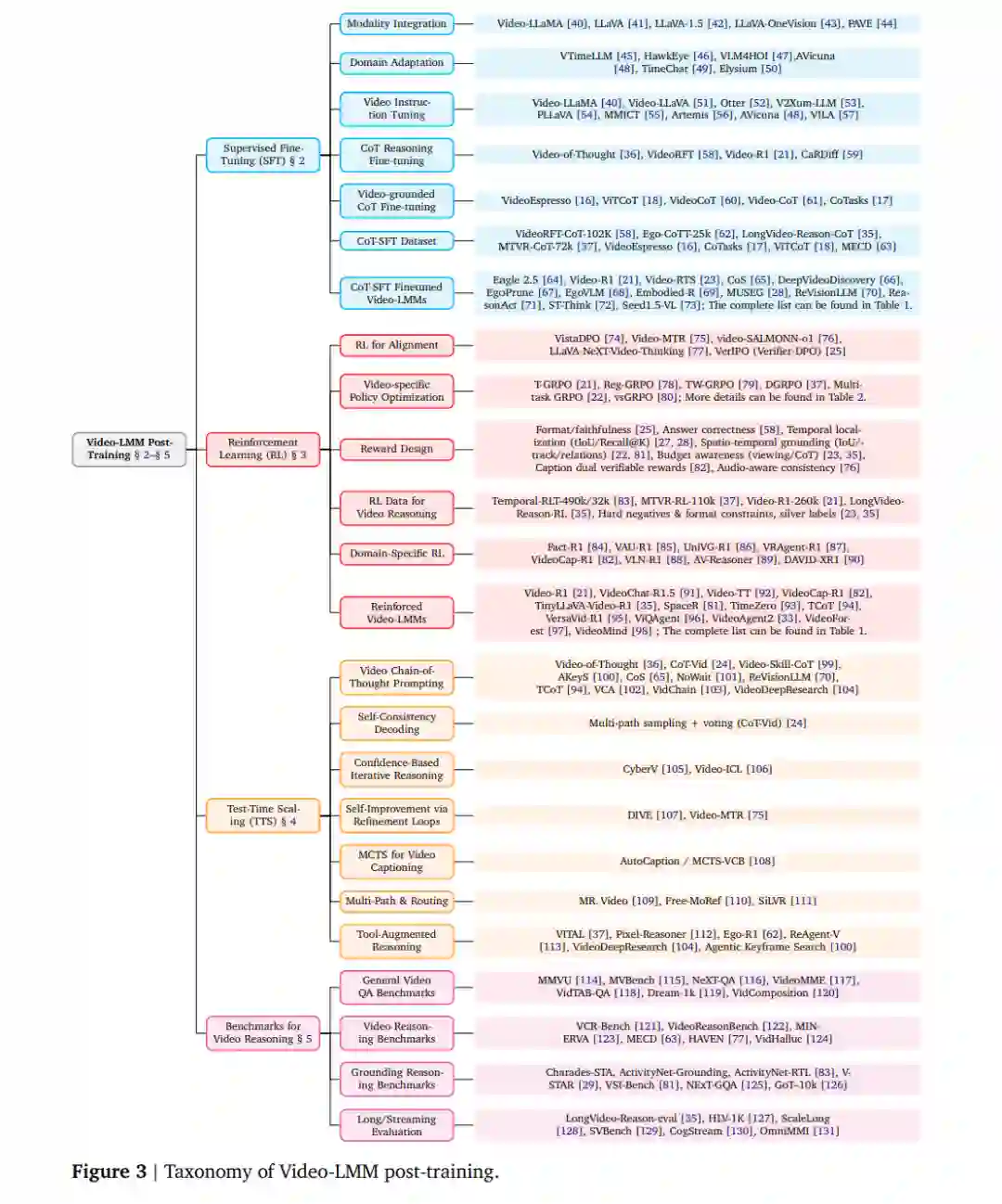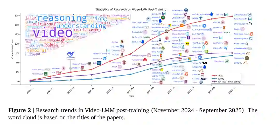 全面综述 Video-LMM的后训练方法,涵盖SFT、RL与TTS三大核心优化组成部分; * 提出系统化分类体系,明确各类后训练技术的功能角色与相互关系,并总结其开放问题与未来方向; * 提供实践指南,汇总用于评估Video-LMM后训练效果的关键基准、数据集与指标。