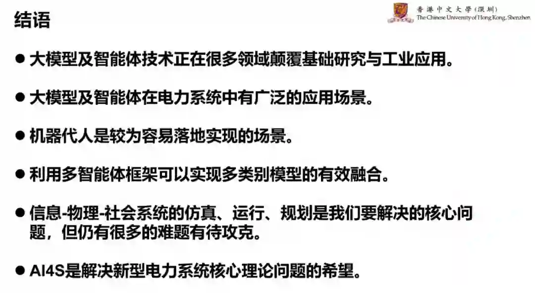 AI大模型技术通过"预训练-微调-强化学习"三阶段训练(如LoRA技术显著降低微调成本),赋予智能体工具调用、任务分解、长期记忆和自主学习能力,正深度融入电力系统应用:在负荷预测领域,通过ITA-LF框架整合新闻事件等多模态数据,将预测精度提升至95.06%,显著优于传统模型;在调度领域,构建DispatchLLM-70b模型统一处理语音、日志等数据,生成安全操作序列;在复杂系统仿真中,提出"因果模型+大模型+符号模型"融合框架,结合物理神经网络(PINN)加速计算,并探索多智能体人机协同解决决策可靠性问题;在碳市场分析中,利用大模型模拟企业博弈策略,揭示价格操纵风险。当前挑战集中于大模型"幻觉"、超大规模计算(如10万节点实时分析),未来将通过AI4S(人工智能驱动的科学计算)重构电力系统基础理论,推动数字孪生与跨学科机理研究,实现从机器代人到理论突破的跃迁。