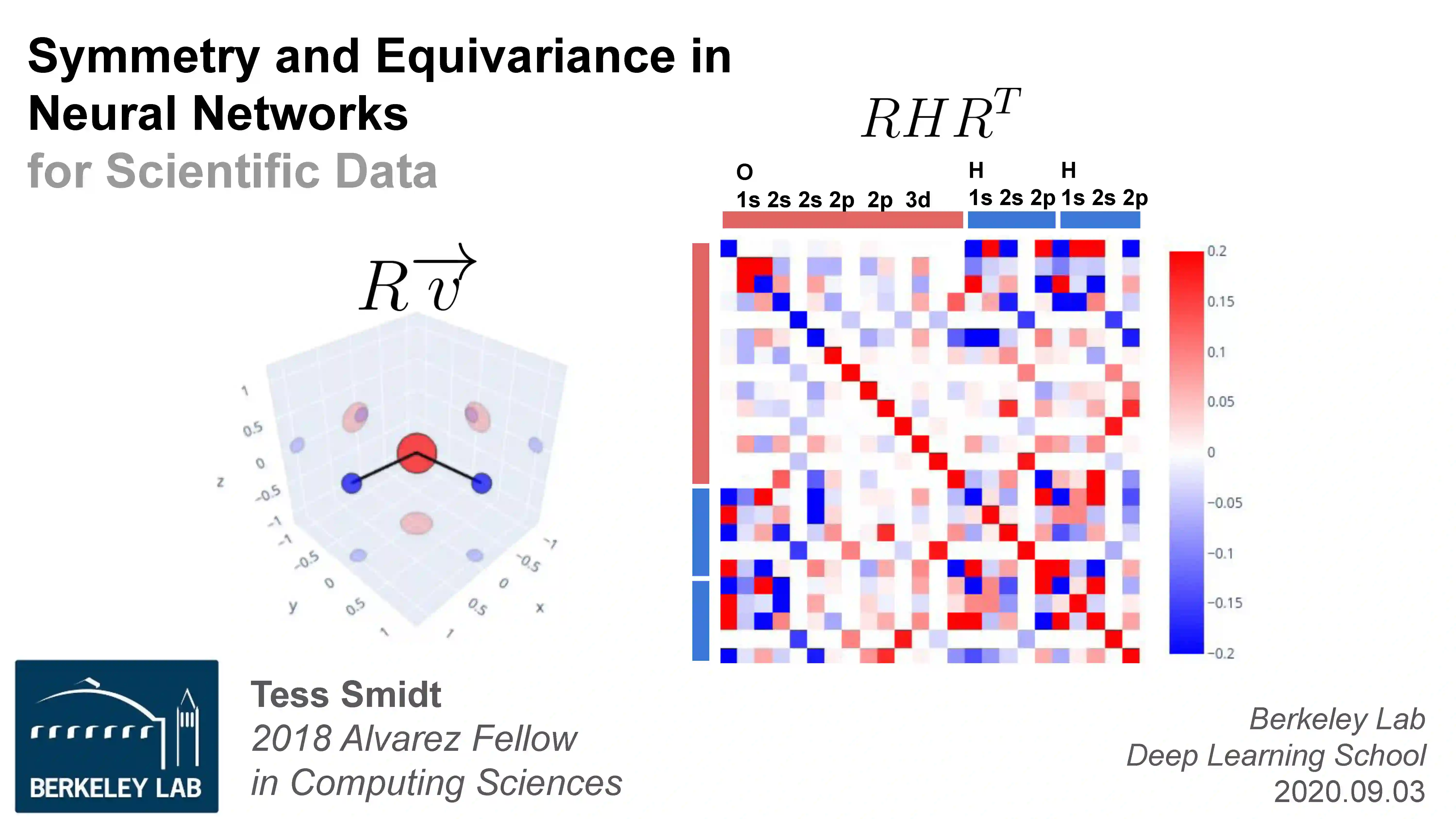 对称可以以多种形式出现。对于三维的物理系统,我们可以自由选择任何坐标系,因此任何物理属性都必须在欧几里得对称的元素下(三维旋转、平移和反演)可预见地变换。对于涉及图的节点和边的算法,我们在计算机内存中节点和边的排列情况下具有对称性。除非另外编码,机器学习模型不会对一个问题的对称性做出任何假设,并且会对坐标系统的任意选择或数组中节点和边的排序非常敏感。在机器学习模型中明确处理对称的主要动机之一是消除对数据增强的需求。另一个动机是,通过将对称编码到方法中,我们可以保证即使模型没有对“对称等效”示例进行明确训练,但模型对一个示例和一个“对称等效”示例会给出“相同”的答案。在这节课中,我们将讨论几种使机器学习模型“对称感知”的方法(例如输入表示、丢失和模型架构)。我们将集中讨论如何在神经网络中处理三维欧几里得对称和置换对称,描述这些对称的非直观和有益的结果,并讨论如何建立与你的对称假设一致的训练任务。