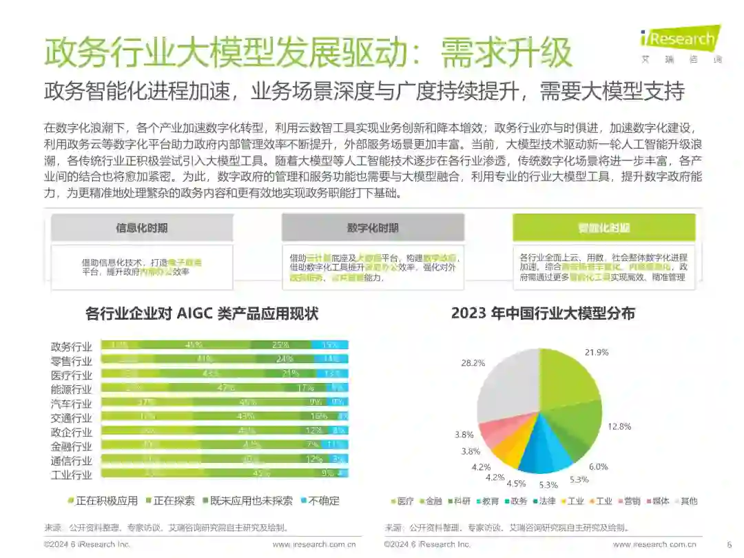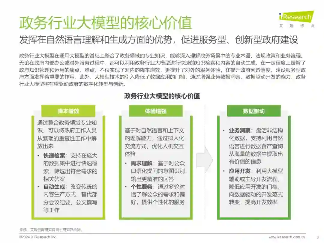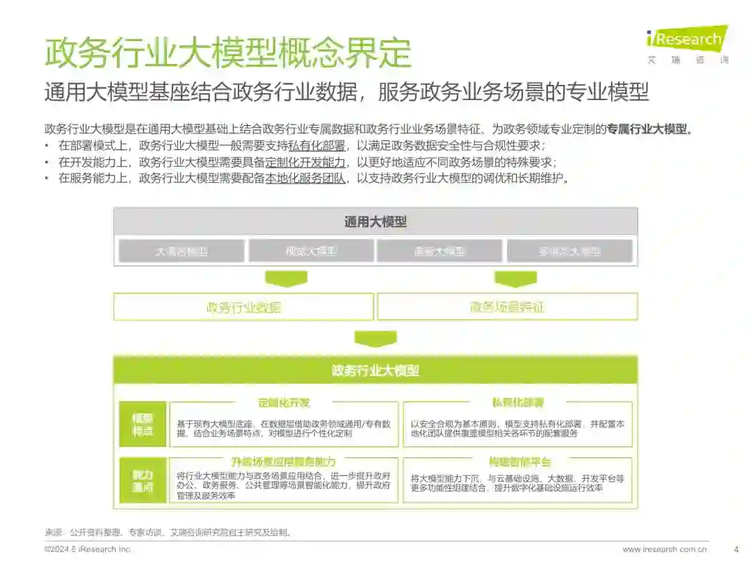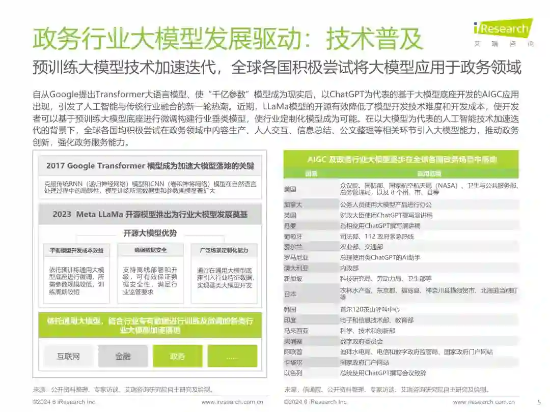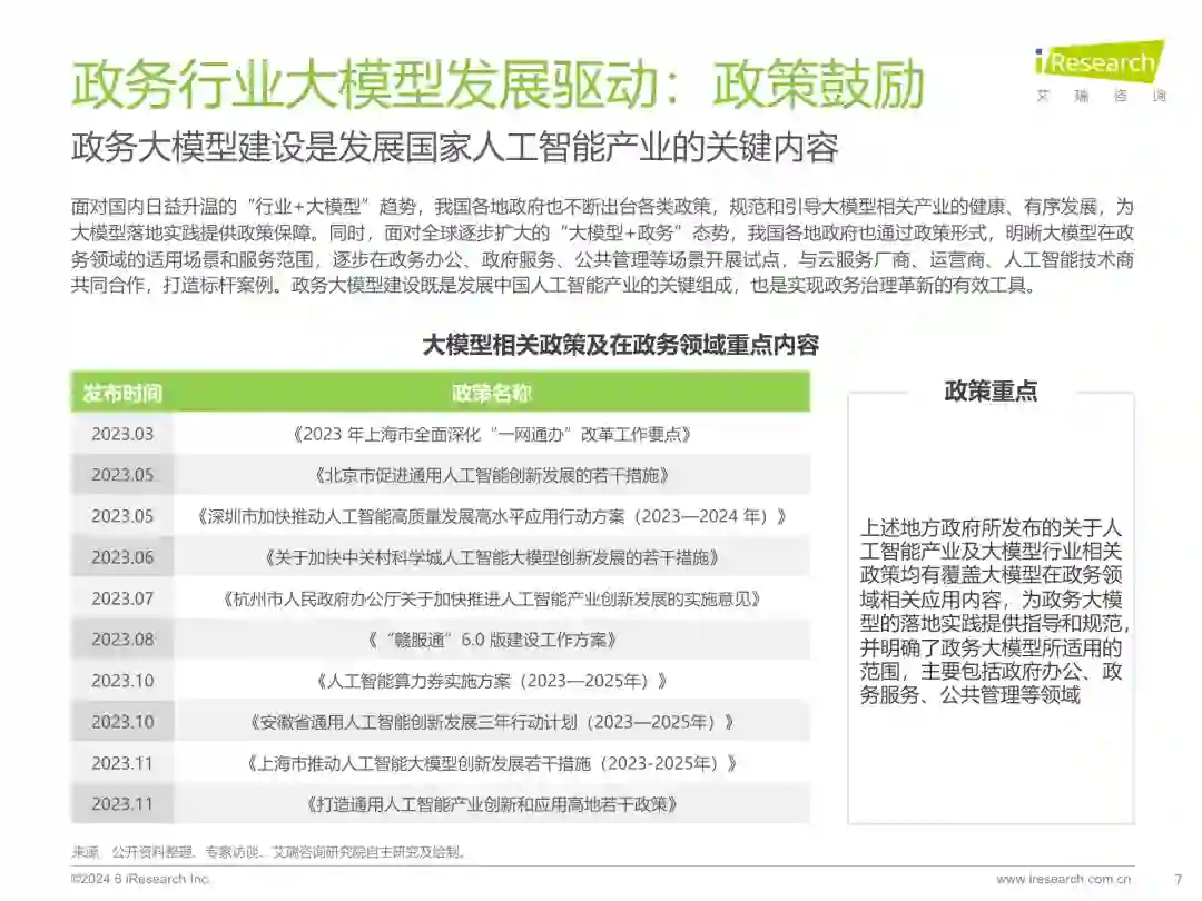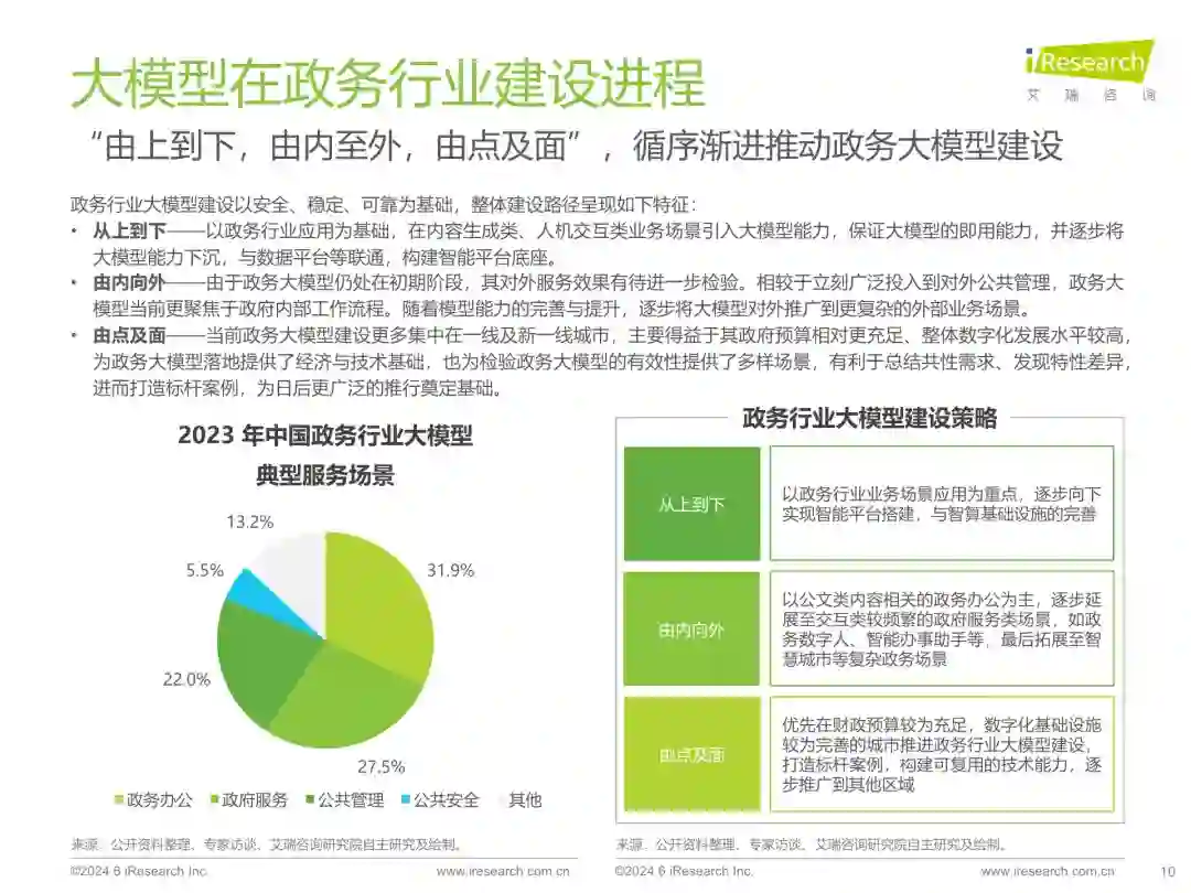 大模型的发展推动人工智能产业加速升级,技术进步、需求升级、政策鼓励成为驱动政务行业大模型从理论走向实践的关键要素。目前,政务行业大模型健身,整体遵循“由上到下,由内至外,由点及面”的思路。安全,技术、服务是政务机构的需求重点,围绕客户需求,云厂商、运营商、数字化解决方案厂商和专业AI厂商发挥各自比较优势,不断强化其在政务大模型领域的竞争力。