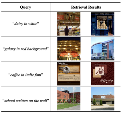 场景文字检索旨在从图片库中搜索包含查询文本的所有图像。目前大多数方法借助OCR框架,存在两方面缺陷:1)难以达到检索精度与速度的良好均衡。如图1所示,以TDSL[1]和Wen et al.[2]为代表的检索方法需要引入显式的文字检测或识别过程,在检索速度上呈现不足。相对而言,Gomez et al.[3]利用一个简洁的Single-shot CNN框架能够达到较快的检索速度,但其是以精度的下降为代价的。2)无法处理不同形式的查询文本。如图2所示,现实生活中人们想要检索的查询文本往往是多样化的。但是,现有方法采用局部检索机制(将单词视为查询单元),不能灵活地泛化到词组级别或属性感知等更广泛的检索场景。