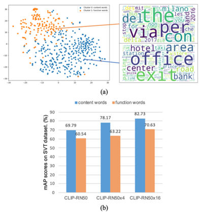 图4 视觉语义概念纠缠。(a)高频场景文字语言特征的t-SNE可视化;(b)原生CLIP模型对于实词和虚词的检索精度对比 如图4(a)所示,作者从MLT训练集中选取高频的500个词,提取其CLIP语言特征,并利用K-means进行簇数为2的聚类。通过t-SNE可视化发现,这些词自然地聚集为实词(如“Hotel”)和虚词(如“The”)两类,其中实词具有明确的语义,视觉语义纠缠程度更高。为了进一步说明该现象对场景文字检索任务的影响,图4(b)对比了原生CLIP模型在实词和虚词上的检索精度,发现虚词检索精度明显低于实词检索精度。由此说明,实词和虚词应该采取不同的检索方案,因此FDP在执行检索之前,会通过聚类结果预先区分查询文本是实词还是虚词。