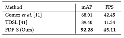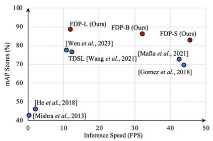 通过与已有方法的性能对比实验(表1)和消融实验(表2),可验证FDP方法的有效性和优越性。在IIIT-STR数据集上,FDP-S与先前最好的方法相比,检索精度提升了4.37%,速度快了4倍。在更有挑战性的SVT和TotalText数据集上,FDP仍然能获得具有竞争力的结果。