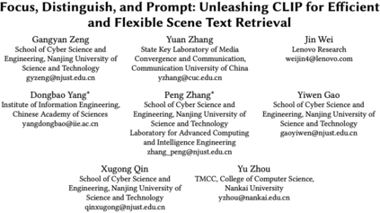 [1] Hao Wang, Xiang Bai, Mingkun Yang, Shenggao Zhu, Jing Wang, and Wenyu Liu. 2021. Scene text retrieval via joint text detection and similarity learning. In CVPR. 4558–4567.[2] Lilong Wen, Yingrong Wang, Dongxiang Zhang, and Gang Chen. 2023. Visual matching is enough for scene text retrieval. In WSDM. 447–455.[3] Lluís Gómez, Andrés Mafla, Marçal Rusinol, and Dimosthenis Karatzas. 2018. Single shot scene text retrieval. In ECCV. 700–715.[4] Kaiyang Zhou, Jingkang Yang, Chen Change Loy, and Ziwei Liu. 2022. Learning to prompt for vision-language models. IJCV 130, 9 (2022), 2337–2348.[5] Yiqi Lin, Conghui He, Alex Jinpeng Wang, Bin Wang, Weijia Li, and Mike Zheng Shou. 2023. Parrot captions teach clip to spot text. arXiv preprint arXiv:2312.14232.[6] Cheng Shi and Sibei Yang. 2023. Logoprompt: Synthetic text images can be good visual prompts for vision-language models. In ICCV. 2932–2941.