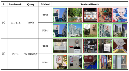 为了验证FDP在处理不同形式查询文本上的优势,作者构建了一个词组级别的场景文字检索数据集PSTR。如表3和图5结果所示,FDP在该数据集上明显优于传统的基于局部检索的方法。图6的定性结果进一步说明FDP能够感知场景文字的颜色、字体和位置等属性信息,具有很好的泛化性。
