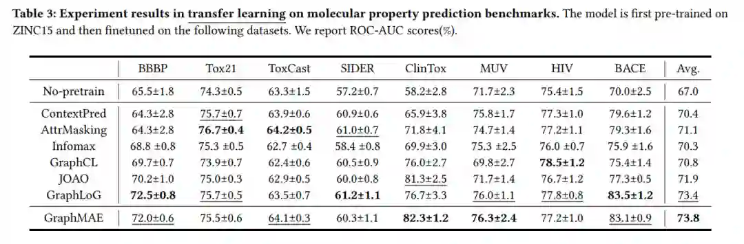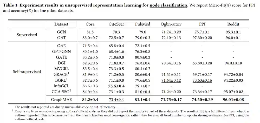 三种任务:1)无监督节点分类;2)无监督图分类;3)分子性质预测的迁移学习 下表是节点分类任务上的结果。首先是无监督的学习,接着固定编码器参数得到节点的嵌入,用节点嵌入训练一个线性分类器,列出20次随机初始化的平均结果。编码器和解码器都用的是标准的图注意力网络。更多细节参看原文。