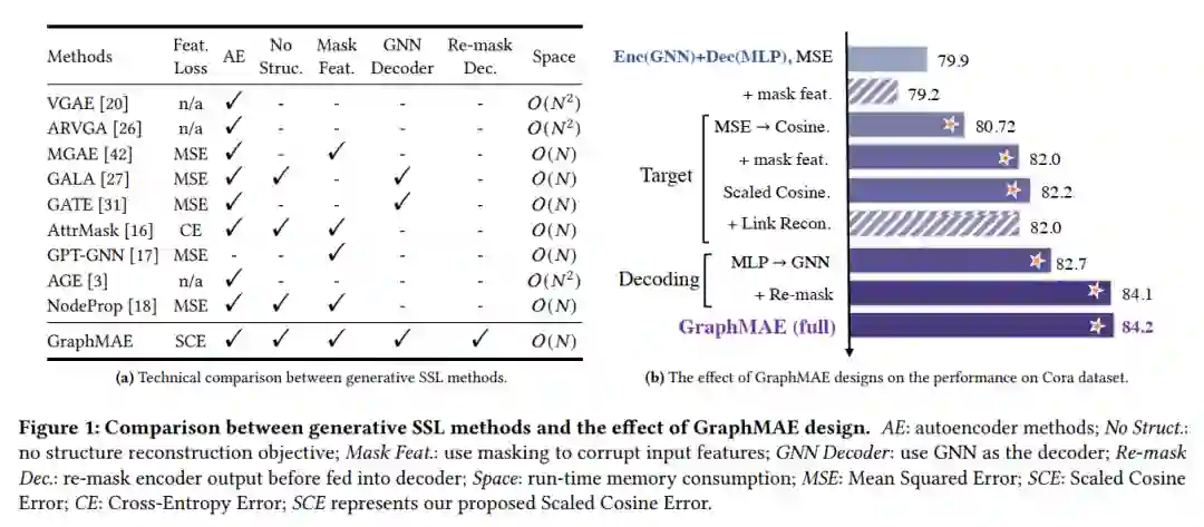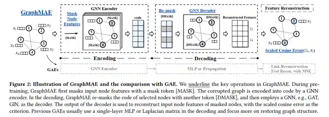 生成式自监督模型在NLP和CV领域得到广泛应用,而在graph领域对比学习占据主导地位,不论是节点分类还是图分类任务,生成式自监督的性能都被对比学习甩“几条街”。虽然如此,对比学习却有着致命缺陷,它要么过度依赖于数据增广,要么需要使用负采样、动量更新或指数滑动平均等策略来避免训练时陷入平凡解。而生成式自监督,特别是图自编码器通常目标是重建图自身的节点特征或结构信息,则会完全规避对比学习的局限。本文发现利用图自编码器,稍加改进,仅仅重建节点特征便能够获得优越的性能。GraphMAE的改进如下图所示: