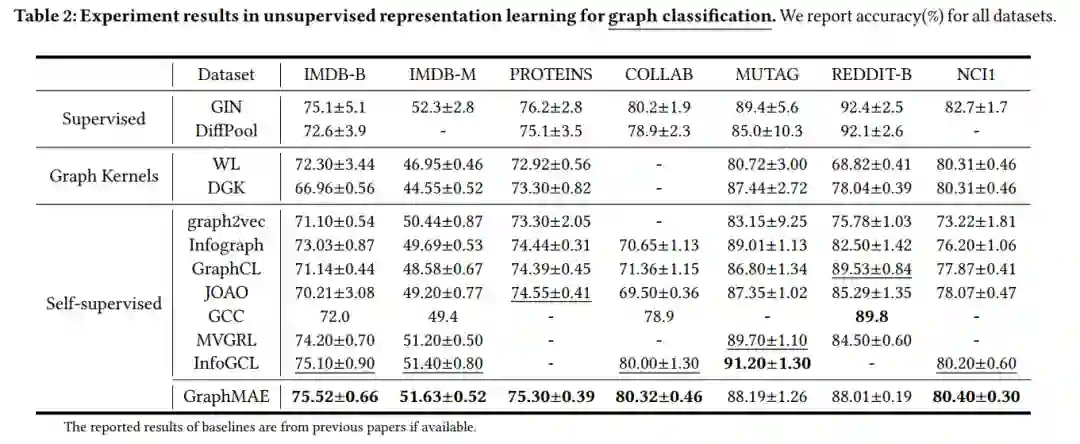下表是图分类任务上的结果。首先无监督训练,得到节点嵌入后经过一个无参数的池化操作得到图级表达,接着训练LIBSVM作为分类器,列出5次十折交叉验证的平均结果。编码器和解码器都是用的图同构网络。更多细节参看原文。
