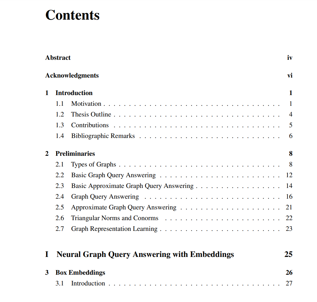部分0:预备知识。我们首先在第2章介绍背景知识,并对图、查询、模糊逻辑和表示学习进行必要的定义。 部分I:知识图谱上的神经图查询应答。我们首先介绍两种受几何属性启发的神经图查询应答算法。这两种算法提出了与符号对应物保持良好一致的神经查询执行方法,同时也能够发现缺失的答案。在第3章,我们介绍了Query2box模型,该模型将查询嵌入为一个超矩形。Query2box设计了一个神经连接运算符,并使用析取范式处理连接。在第4章,我们提出了BetaE模型,这是第一个使用基于Beta分布的嵌入忠实处理否定操作的神经图查询应答算法。
