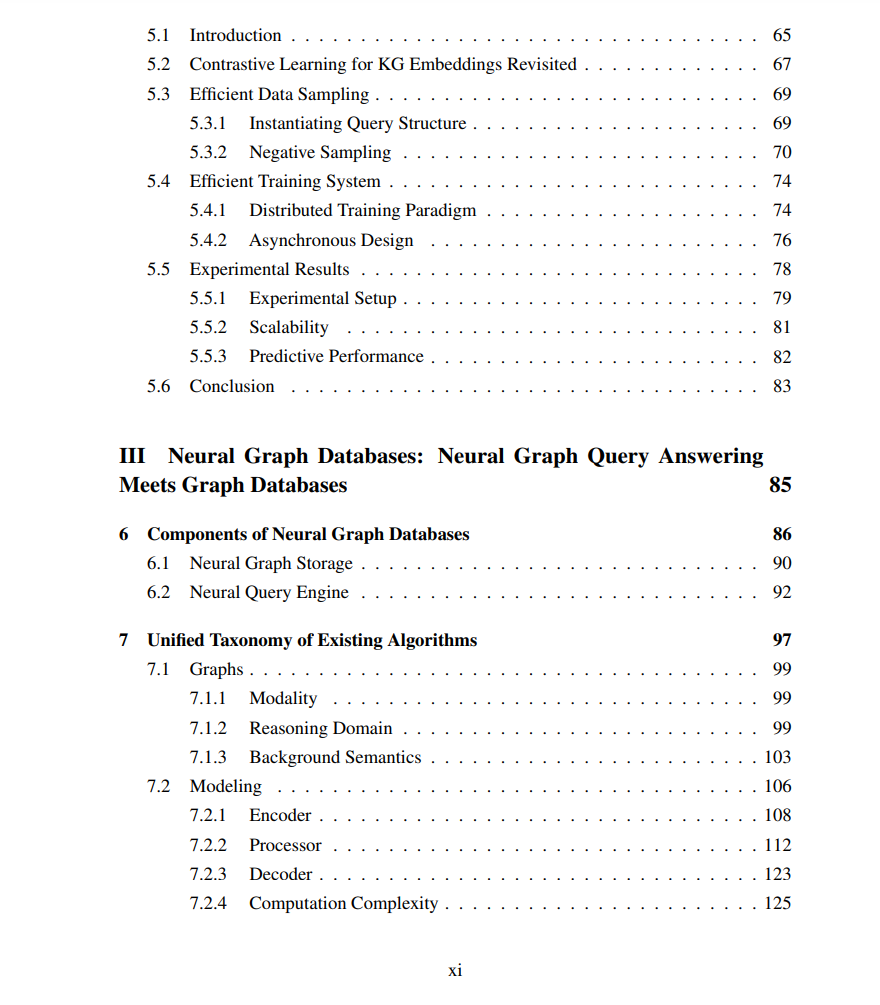 部分III:神经图数据库:神经图查询应答遇到图数据库。最后,我们进一步提出了一个新颖的框架——神经图数据库(NGDB),其中神经图查询应答是核心任务,并通过神经查询嵌入方法来处理。在第6章,我们介绍了NGDB的组成部分:神经图存储和神经查询引擎,它们分别对应于常规图数据库中的两个对应部分的神经版本。在第7章,我们制定了一个分类现有工作的分类法,主要围绕三个轴:图(底层图及其模式背后的逻辑形式主义);建模(用什么神经方法回答查询);查询(可以回答哪些查询)。在第8章,我们列出了神经图查询应答算法的应用。