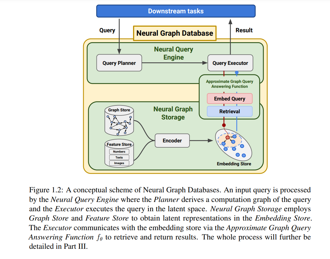 在这篇论文中,我们介绍了神经图数据库(NGDBs)的概念,其中神经图查询答案是其核心。NGDB包括神经图存储和神经图引擎,扩展了图数据库的思想。在NGDB下,我们提供了一系列神经图查询答案方法、数据集、系统、指标和广泛的应用。在第二章中,我们从不同类型的图、图查询、模糊逻辑和图表示学习的定义开始。这为论文提供了基础和背景。在第一部分,我们讨论了两项关于查询嵌入的工作,Query2box和BetaE。Query2box引入了第一个神经图查询答案算法,该算法模拟存在量化、析取和合取操作。BetaE进一步扩展了其能力,包括否定操作。在第二部分,我们设计了第一个也是最可扩展的系统,SMORE,它允许在极大的图上训练神经图查询答案算法。在第三部分,我们介绍了NGDB的整体框架和组件。我们进一步提供了从图、建模、查询和数据集的角度对现有神经图查询答案算法的统一分类。整篇论文介绍了神经图查询答案的任务和NGDB的框架,提出了两个新颖的算法,并指出了NGDB的有前途的方向、未解决的问题和应用。