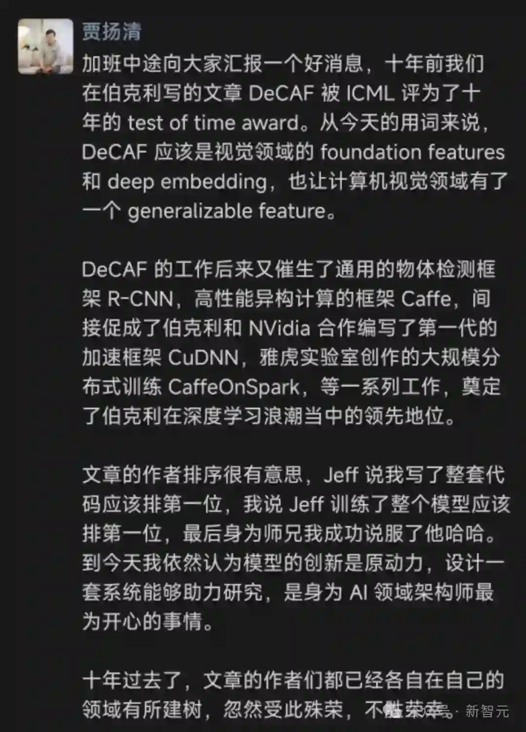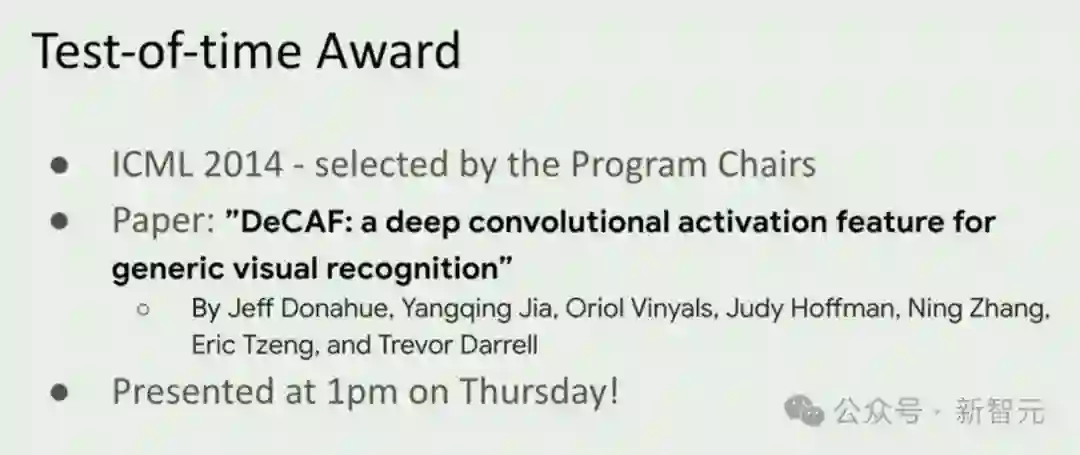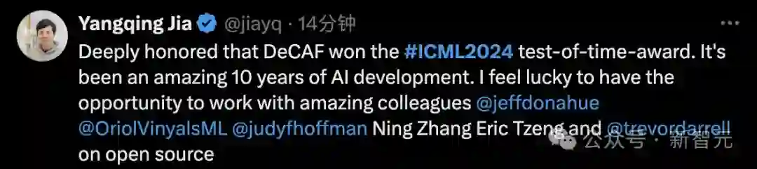 值得一提的是,AI大牛贾扬清等人在2013年10月发表的论文DeCAF,获得了时间检验奖。 刚刚,他发文表示,深感荣幸获此殊荣。