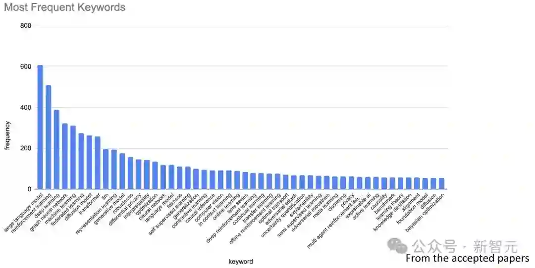 根据被录用的论文,ICML汇总了出现的高频词,也正是这一年的热点词: 大模型出现频率最高,超过了600+次。 其次是强化学习、深度学习、图神经网络、机器学习、联邦学习、扩散模型、Transformer、LLM、表示学习、生成模型等等。
