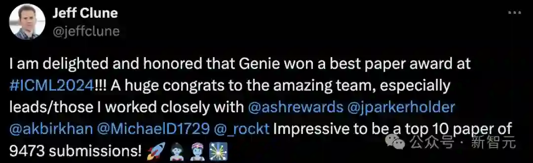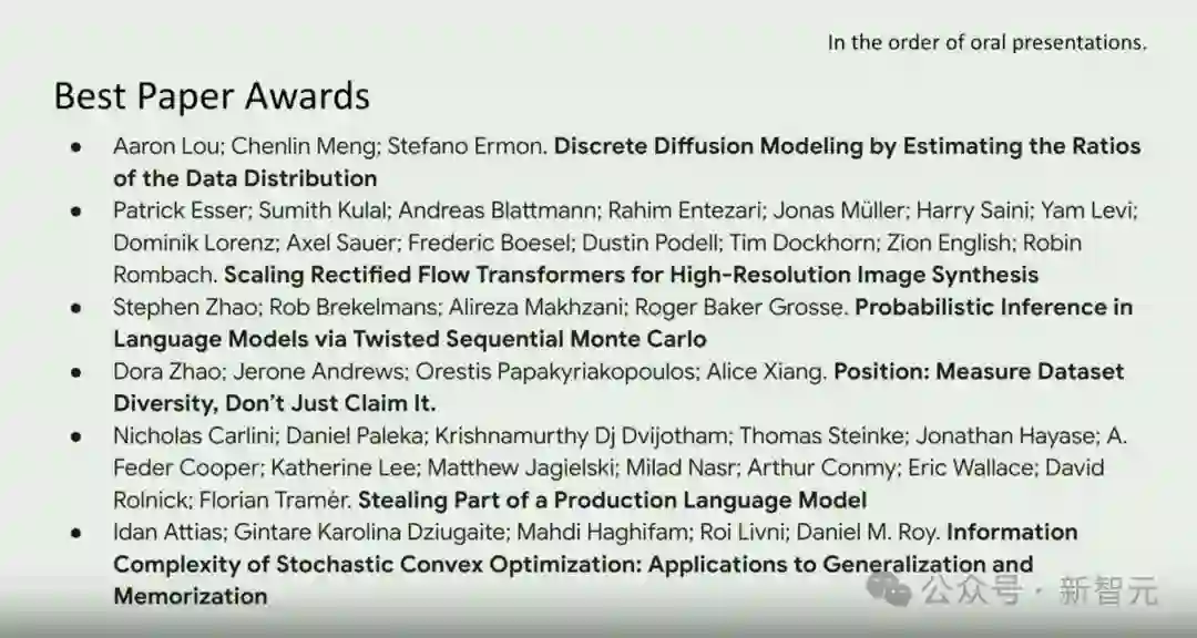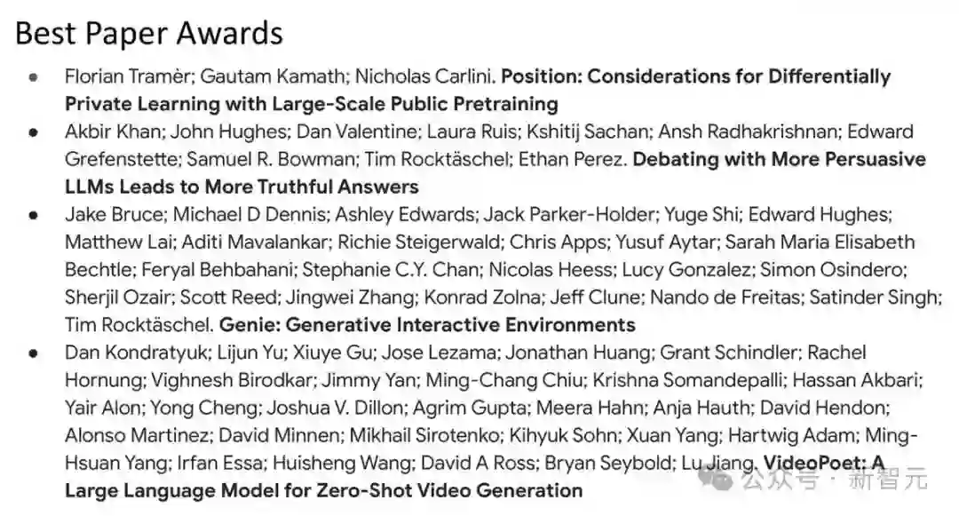 编辑:桃子 好困**【新智元导读】**一年一度的ICML顶会大奖终于公布了!今年,共有十篇论文夺得最佳论文奖,而这其中的3篇可谓是家喻户晓——图像生成模型SD3、视频生成模型VideoPoet、基础世界模型Genie。另外,时间检验奖颁给了贾扬清和团队十年前提出的框架DeCAF。