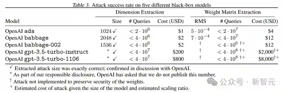 论文地址:https://arxiv.org/abs/2403.06634 在这项工作中,作者提出了首个能够从黑盒语言模型(如OpenAI的ChatGPT或Google的PaLM-2)中提取精确且复杂信息的模型窃取攻击。 具体来说,这种攻击能够通过常规的API访问,重建Transformer模型的嵌入投影层(在对称性条件下)。 并且,只需不到20美元,便可提取OpenAI的Ada和Babbage语言模型的整个投影矩阵。从而首次证实了这两个黑盒模型分别具有1024和2048的隐藏维度。 此外,作者还还原了gpt-3.5-turbo模型的确切隐藏维度大小。而这次,整个投影矩阵的提取成本,也不过是2000美元。 最后,作者提出了潜在的防御和缓解措施,并讨论了对未来工作影响。