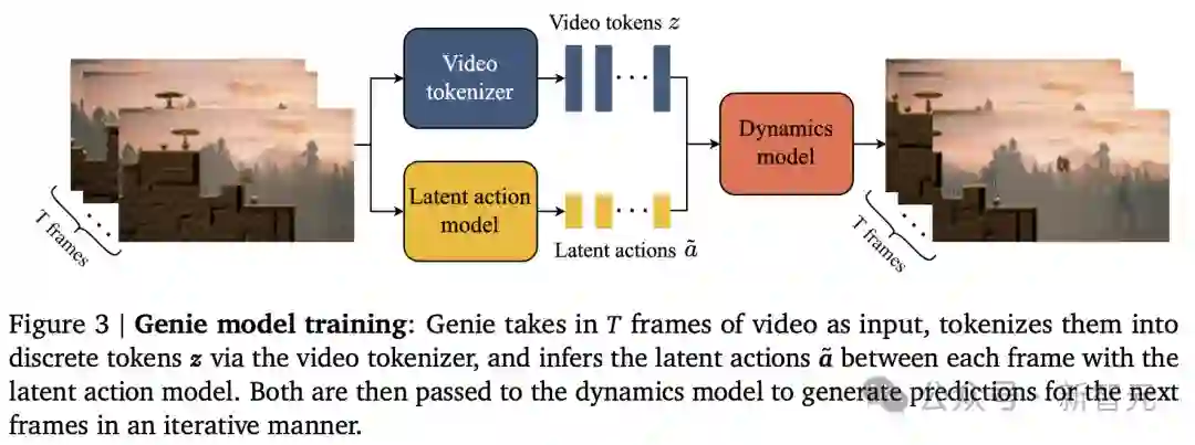 Genie的疯狂之处在于,学习了20万小时的未标注互联网视频,无需监督即可训练。 无需任何动作标注,便可以确定谁是主角,并让用户能够在生成的世界中对其控制。 具体来说,它是通过潜动作(latent action)模型、视频分词器,以及自回归动态模型三大核心组件来实现的。
