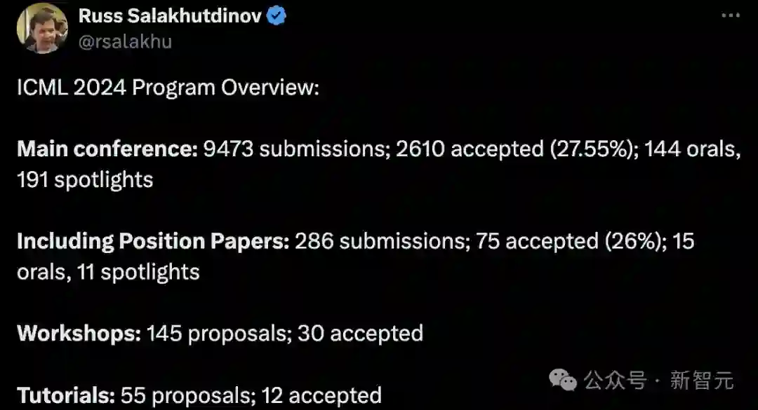 CMU教授、Meta GenAI副总Russ Salakhutdinov对ICML 2024整体录用结果做了一个总结: 这届顶会一共收到了9473篇论文,其中2610篇被录用,录用率为27.55%。144篇是Oral,还有191篇是Spotlight。 今年全新引入的Position论文,提交有286篇,75篇被接收(26%)。15篇是Oral,11篇是Spotlight。 另外,Workshop中有145个提案,30个被接收。Tutorial有55个提案,12个被接收。