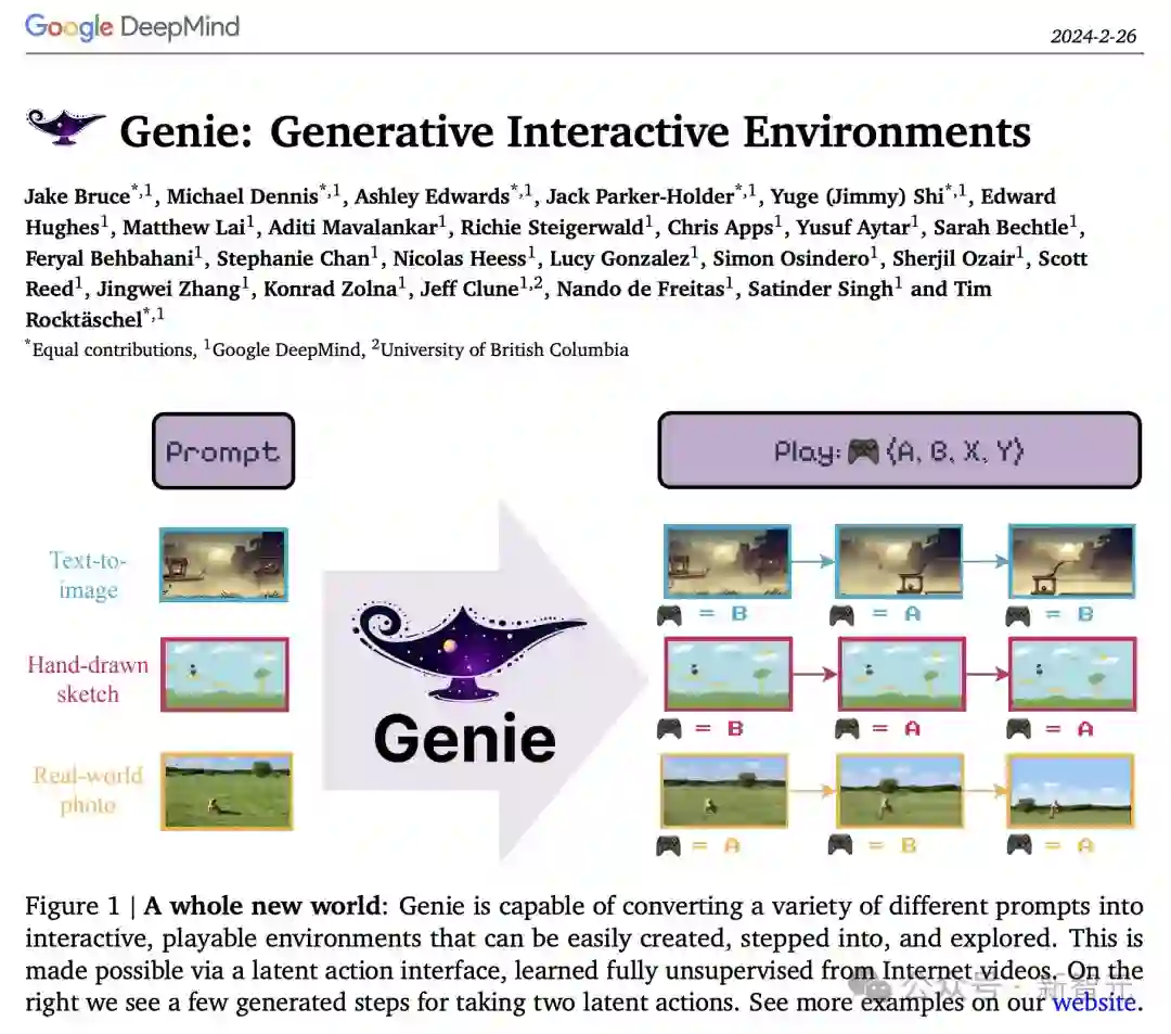 论文地址:https://arxiv.org/pdf/2402.15391 谷歌DeepMind团队发布的基础世界模型——Genie「精灵」。 从一个图像,一张照片,一个草图中,它就能生成一个无穷无尽的世界。