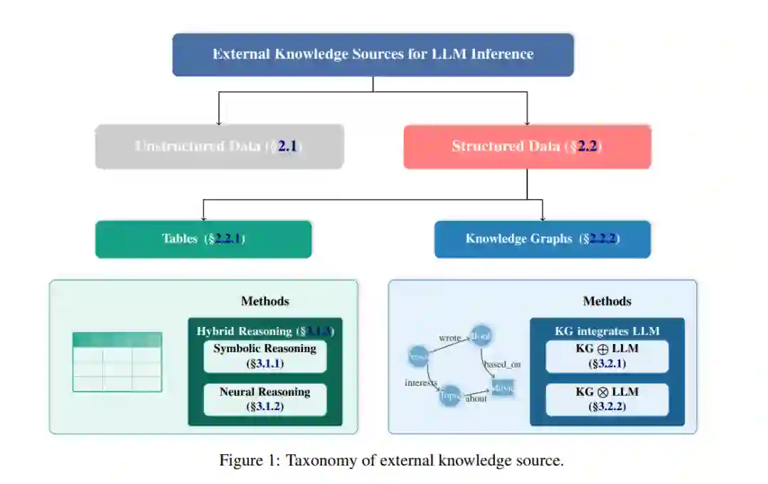 大型语言模型(LLMs)的进展(Radford 等,2019;Brown 等,2020a;Achiam 等,2023;Touvron 等,2023a,b;Grattafiori 等,2024)显著推动了自然语言处理的进步。这些模型在自然语言理解、生成和推理方面表现出色。然而,它们仍然面临若干限制,促使研究人员将外部知识整合到模型中,以提高性能、可靠性和可解释性。 主要的限制包括:1)由于训练数据的截止,知识过时;2)幻觉问题(Huang 等,2025);3)缺乏领域特定的专业知识;4)响应缺乏透明度。为了解决这些问题,研究人员正在通过在推理过程中引入外部信息,将LLM转变为具有知识感知的助手。尽管在这一领域取得了快速发展,但知识增强LLM推理的格局仍然是碎片化的,不同的数据模态和领域的方法不断演变。这些方法大多遵循检索-增强-生成(RAG)框架(Fan 等,2024),该框架专注于检索相关的外部知识,通过模型的内部理解进行增强,并生成响应。由于这种方法在减少幻觉的同时保留了LLM的生成能力,它已成为主流。 本文首先介绍了知识来源的分类法,将其分为结构化(Zhang 等,2024;Pan 等,2024;Dagdelen 等,2024)和非结构化(Gao 等,2024;Yin 等,2024;Selmy 等,2024)形式。我们主要关注结构化数据,因为它具有明确的关系和推理能力,回顾了利用表格和知识图谱(KGs)数据的相关方法。这包括符号推理(Rajkumar 等,2022;Nahid 和 Rafiei,2024a)、神经推理(Wang 等,2024)和混合推理(Nahid 和 Rafiei,2024b;Zhang 等,2025;Nguyen 等,2025)用于表格数据的处理,以及松散耦合(Baek 等,2023;Li 等,2024b;Wu 等,2023)和紧密耦合(Sun 等,2024;Ma 等,2025;Chen 等,2024)用于知识图谱的集成方法。我们通过比较这些方法的优势、局限性和主要权衡,总结了它们的特点。 通过关注知识集成,我们强调的是在推理过程中增强LLM的方法,而非预训练或微调。这种方法需要较少的资源,并允许动态响应,因为外部知识可以根据需要实时添加,而无需重新训练,同时保持模型性能。 本综述的主要贡献包括: • 对外部知识来源和集成策略的全面分类,特别关注表格和知识图谱(KGs)。 • 通过基准实验对代表性方法进行比较分析,突出其优缺点和权衡。 • 提供实践性见解和指导,为未来的知识增强LLM研究提供参考。