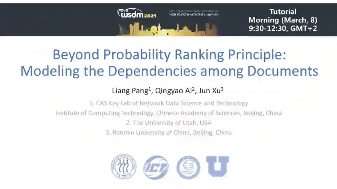 在本教程中,我们旨在对排名模型超越PRP原则的最新进展进行全面的调研。我们的教程提供一种视角,因为我们试图根据它们的内在假设进行分类,并将标准问题形式化。这样,我们期待着研究者们对这一领域的关注,从而使信息检索技术有一个长足的进步。本教程主要由三部分组成。首先,我们介绍了排序问题和众所周知的概率排序原理。其次,我们提出了PRP原则下的传统方法。最后,我们说明了PRP原则的局限性,并介绍了以顺序方式和全局方式对文档之间的依赖关系建模的最新工作。