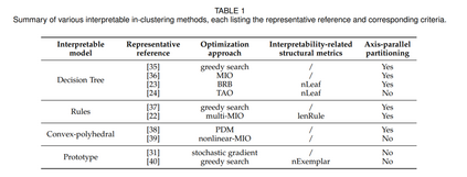 图2所示的分类框架为根据四个不同标准对聚类方法进行分类提供了框架。这些标准是描述现有可解释聚类方法的维度。同时,它们也可以用于识别符合特定可解释性和性能要求的方法。
