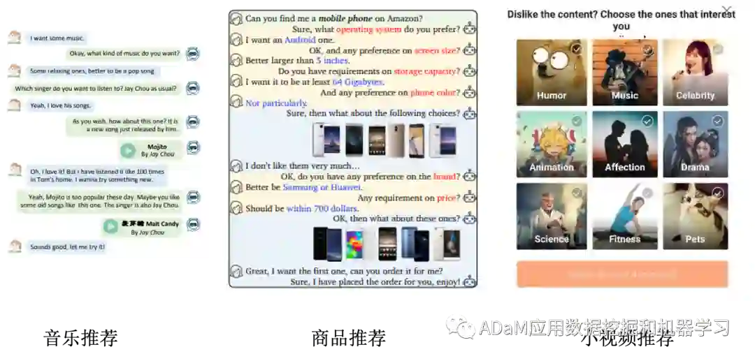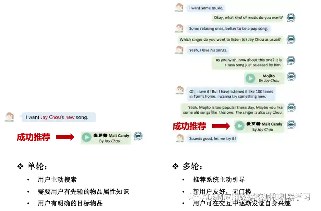 2.2.1 **共性:**面向推荐任务,都需要理解用户兴趣偏好,为用户筛选信息 **区别:**使用数据不同: (1)传统推荐系统主要依赖用户的历史交互数据。 (2)对话推荐系统主要依赖用户的在线反馈数据。 推荐模型更新方式不同: (1)传统推荐系统是静态的,其从用户的历史交互信息中来估计用户偏好,上线后不做更新,更新需定期下线。 (2)对话推荐系统是动态的,其与用户进行交互,在模型有不确定的地方,可以主动咨询用户,实时更新推荐模型参数。