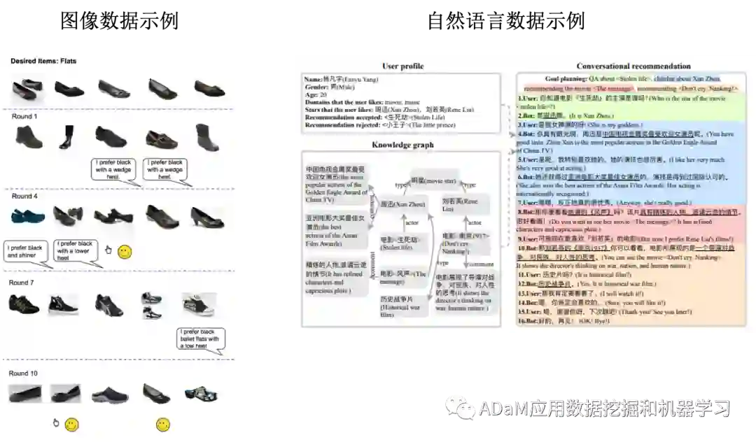 对话推荐的交互形式既可以是语音、自然语言语句,也可以是更为一般的用户交互行为数据(如点击、浏览、购买等)。因此在对话推荐的研究工作中,常用的数据集也分为两类:第一类是研究者将用户交互语音或语句与推荐数据结合,人工构造的数据集;第二类是更为一般的推荐系统通用数据集。