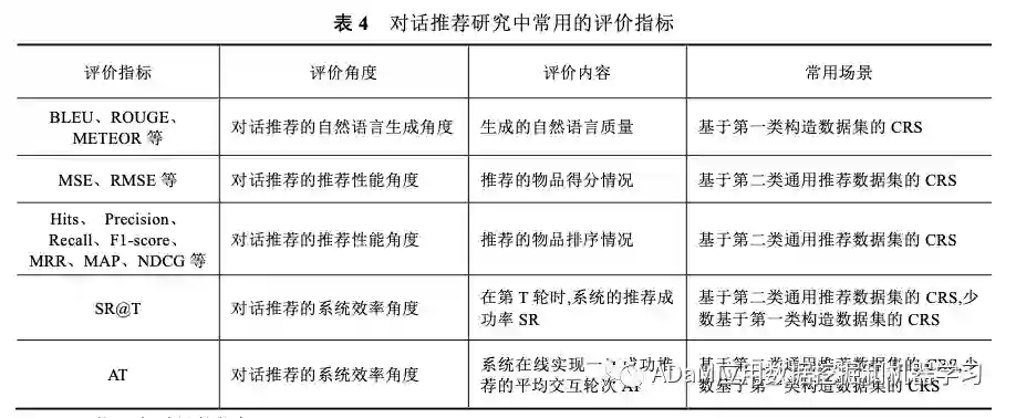 在两类不同类型数据集的应用场景下,对话推荐的评价指标也不相同,目前尚没有统一且成熟的评价指标体系来评价对话推荐系统的功能。如表所示,在对话推荐相关的研究工作中,研究者由于研究的出发点和关注的角度不同,往往在实验中使用不同的评价指标,从其关注的某几个方面评价对话推荐的效果。 根据各类指标的评估内容和角度,把目前对话推荐任务的相关评价指标分为三类: (1)评价对话推荐的语言质量的指标; (2)评价对话推荐的推荐性能的指标; (3)评价对话推荐的系统效率的指标。