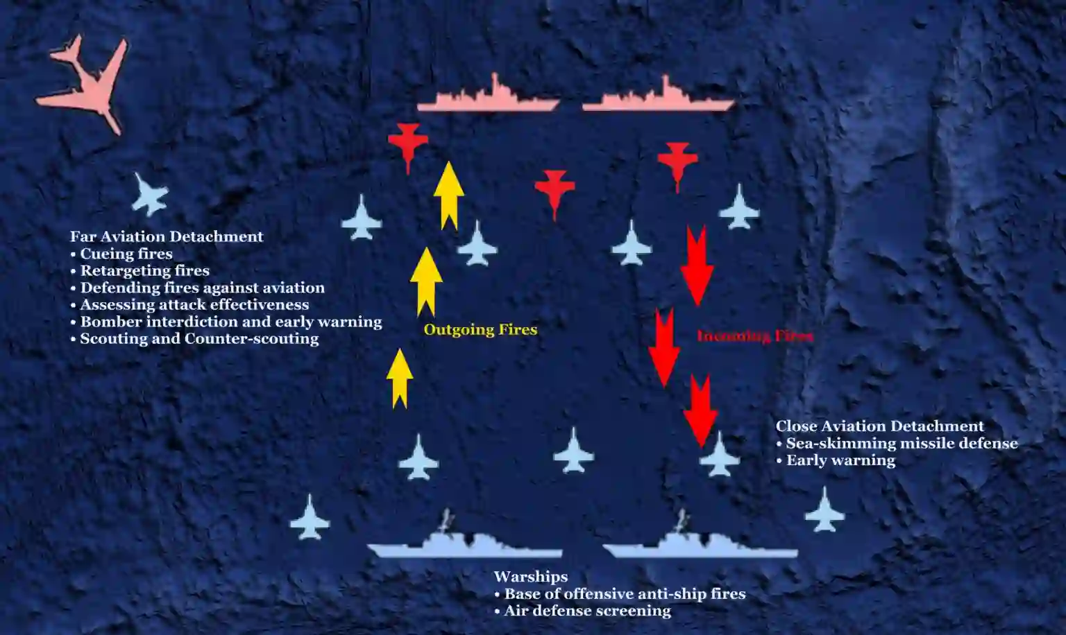 作为一种潜在的新的军事观察员部队组合,可以考虑由两艘驱逐舰组成的部队,并由一个舰载机中队提供支援。舰载机中队的一半留在驱逐舰附近,以便在掠海威胁越过战舰地平线之前将其击败,并提供早期预警,如防空和最后一击。中队的另一半在两艘驱逐舰的最前方,负责侦察、反侦察和拦截轰炸机。前线航空兵还帮助引导战舰向目标发射礼炮,为礼炮提供重定向支持,保护礼炮免受航空兵的威胁,并评估礼炮对目标的打击效果。前线航空兵是在敌对舰队之间的关键空间争夺空中和信息优势的主要角色。如果这些前线航空兵部队受到对方飞机的严重威胁,他们可以拉到水面战舰后面,利用其防空能力。离驱逐舰较近的飞机可以由 F/A-18 和 E-2D 来执行任务。F-35 具有更远的航程和强大的传感器融合能力,是执行前沿任务的理想选择。