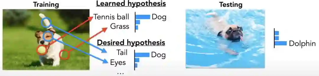 图1:基于监督学习的图像分类算法在测试集(如左图所示)优化训练损失函数的结果是通过特征与图像标签间的相关性来做分类,因此在测试集(如右图所示)上由于检测到水池的背景错误地将小狗分类为了海豚(取自MIT EI Seminar-Pulkit Agrawal-The Task Specification Problem,https://www.youtube.com/watch?v=2el3GdwS1mg&t=1962s&ab_channel=MITEmbodiedIntelligence)。