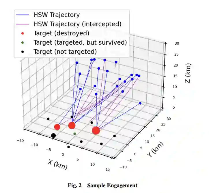 利用深度强化学习(RL)来优化针对多目标的多车高超音速打击的武器与目标分配(WTA)策略。目标是在每一集中最大化被摧毁目标的总价值。每个随机生成的事件都会改变高超音速打击武器(HSW)和目标的数量和初始条件、目标的价值分布以及 HSW 被拦截的概率。们将此 WTA 策略的性能与使用非线性整数编程(NLIP)推导出的基准 WTA 策略的性能进行了比较,发现 RL WTA 策略的性能接近最优,计算速度提高了 1000 倍,允许实时操作,有利于任务终局的自主决策。