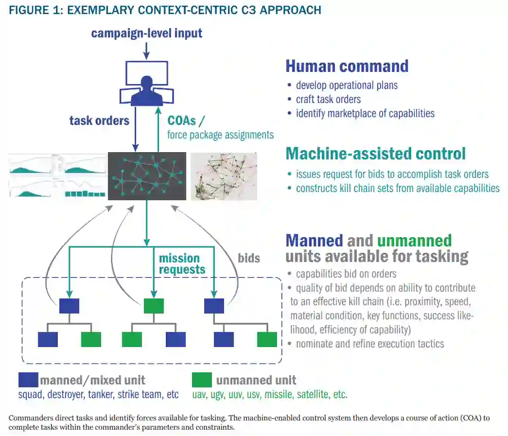 也许以决策为中心的战争最具破坏性的因素是它将如何改变美军的C2流程。为了充分挖掘分解的和更可组合的部队的价值,"马赛克战争 "将依赖于人类指挥和机器控制的结合。如果在不改变相关C2流程的情况下实施部队设计,与传统部队相比,指挥官及其参谋部将难以管理分解部队中的大量元素。如果没有自动控制系统,指挥官也将更难利用以决策为中心的部队的可组合性来为对手制造复杂性,或对敌人的防御和反制措施进行重新组合。