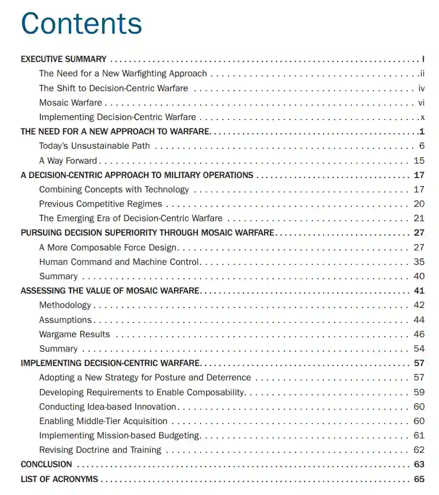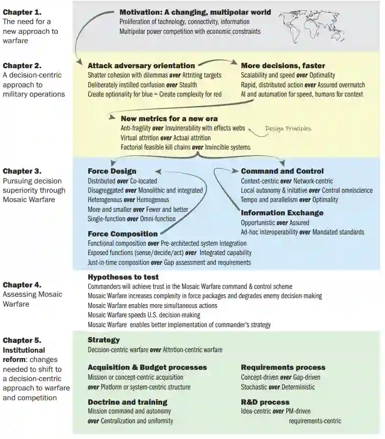 DARPA的马赛克战争概念为实施以决策为中心的战争提供了一种方法。马赛克战争的中心思想是通过使用人的指挥和机器的控制,快速组成和重新组合更加分散的美军部队,为美国部队创造适应性,为敌人创造复杂性或不确定性。实施 "马赛克战争 "或其他形式的以决策为中心的战争将需要对美国部队的设计和C2过程进行重大改变。