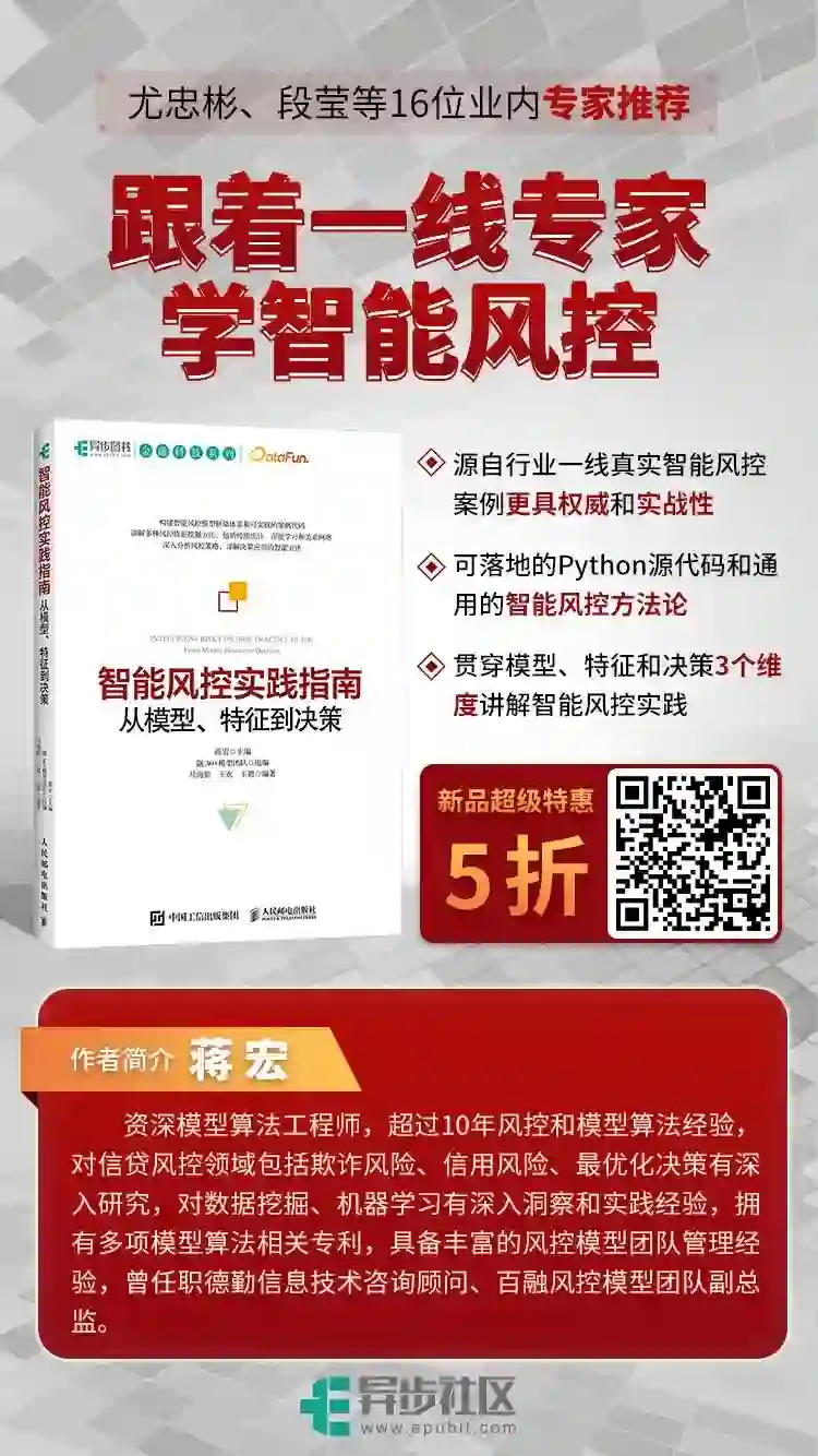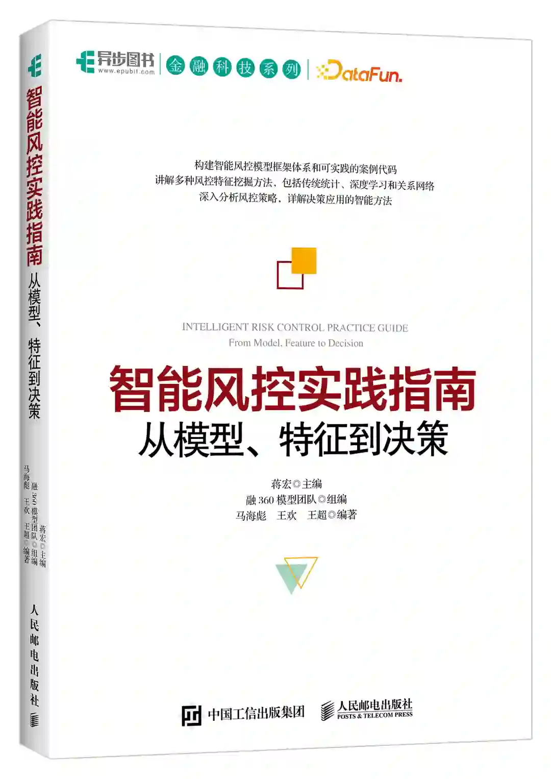 ▲主编:蒋宏 ▲组编:融360模型团队 ▲编著:马海彪 王欢 王超 智能风控已经被提及了很多年,在业界也有诸多应用实践,但是,智能风控相关书籍中,能够阐述完整智能风控体系,将智能风控各个环节融会贯通并结合实际案例的还是凤毛麟角。经过十余年的沉淀,蒋宏老师以及他的团队将智能风控的核心方法、流程和应用实践整理成书籍出版,相信能够帮助到智能风控领域的从业者。