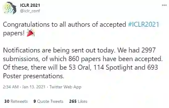刚刚ICLR 2021论文结果公布了!本次ICLR 2021一共有2997篇论文提交,其中最终共有860篇被接收,其中53篇orals,114篇spotlights,693篇poster。录取率为28.7%。