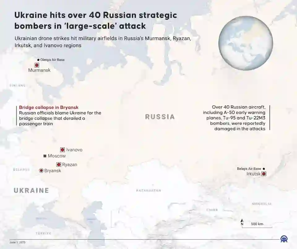 周日行动中,乌方同时打击了伊万诺沃谢韦尔内、佳吉列沃、奥列尼亚、别拉亚四大基地,另有第五辆卡车在远东乌克兰卡基地外投放失败。乌方共出动117架FPV无人机,官方宣称摧毁逾40架俄战略军机。SBU局长瓦西尔·马柳克证实,遭袭目标包括图-95MS、图-22M3、图-160轰炸机及一架A-50空中预警机——其中西伯利亚别拉亚基地遇袭凸显SBU的远程打击能力。