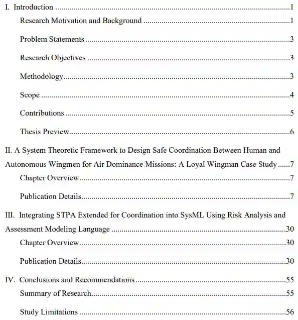 本论文后续结构如下:第二、三章包含基于本研究的待发表成果。第二章提出并描述用于空战人工智能体安全协调设计的STPA-Coord框架。第三章展示通过SysML(而非传统文档方法)实施STPA-Coord的发现,并提出基于RAAML的STPA-Coord分析方法论。第二章回应研究问题1与2,第三章回应问题3与4。第四章总结研究目标、提出未来研究方向,并阐述对学术界与国防部的影响。附录包含第二章未列出的补充STPA-Coord分析结果。