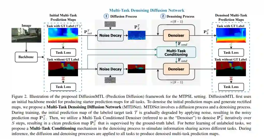 最近,从部分标注数据学习多个密集场景理解任务的实际问题越来越受到关注,其中每个训练样本只为任务子集标注了标签。在训练中缺失任务标签会导致低质量和噪声预测,这一点可以从最新方法中观察到。为了解决这个问题,我们将部分标注的多任务密集预测重新表述为像素级去噪问题,并提出了一种新颖的多任务去噪扩散框架,命名为DiffusionMTL。它设计了一个联合扩散和去噪范式来模拟任务预测或特征图中潜在的噪声分布,并为不同的任务生成校正输出。为了在去噪中利用多任务一致性,我们进一步引入了一种多任务条件策略,该策略可以隐式地利用任务的互补性质来帮助学习未标注的任务,从而提高不同任务的去噪性能。大量的定量和定性实验表明,所提出的多任务去噪扩散模型能显著改善多任务预测图,并在三个具有挑战性的多任务基准测试中,在两种不同的部分标注评估设置下超越最新方法。代码可在 https://prismformore.github.io/diffusionmtl 获取。