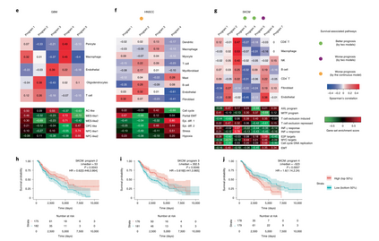 BayesPrism识别恶性细胞内在基因程序 作者在BayesPrism中开发了一个用于推断基因程序的线性组合的模块,在从非恶性细胞类型中分解出基因表达后,解释了bulk RNA-seq中的表达异质性(图4a),作者在由28GBMs读数聚集产生的伪bulk数据集上验证了该方法,BayesPrism恢复的基因程序与最近通过对同一数据集的6863个单一恶性细胞进行因子化得到的基因程序相似(图4b)。研究发现,基于BayesPrism学习的每个基因程序的权重与分配给四个主要亚型肿瘤中的细胞比例相关(图4c,d)。作者将嵌入学习应用于GBM、HNSCC和SKCM,揭示了GBM中与先前研究相似的几个程序,包括程序3(经典和AC类)、程序4(间充质)和程序5(前神经、OPC和NPC类)(图4e)。在HNSCC中,程序1因单细胞研究(图4f)确定的部分EMT程序而丰富,与存活率呈负相关(P=0.017,瓦尔德检验)。在SKCM中,作者确定了多个与AXL和MITF基因程序相关的生存相关基因程序(之前使用TCGA批量数据报告),以及一个T细胞排除程序(在最近的scRNA-seq研究中确定;图4g-j)。与基因集富集分析一致,BayesPrism没有发现任何与HNSCC中的间充质亚型或GBM中的神经亚型相似的基因程序。因此,作者认为,嵌入学习模块减少了非恶性细胞类型的影响,导致了恶性细胞固有的基因程序。