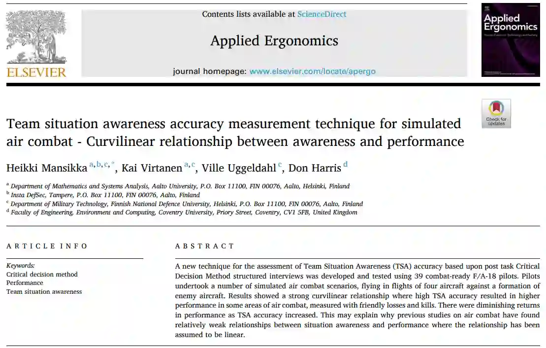 在任务后关键决策法结构化访谈的基础上,开发了一种评估团队态势感知(TSA)准确性的新技术,并使用39名准备作战的F/A-18飞行员进行测试。飞行员们进行了一些模拟空战场景,以四架飞机组成的机队对抗敌机编队。结果显示了一种强烈的曲线关系,即高的TSA准确度导致在空战的某些方面有更高的表现,用友军的损失和杀伤来衡量。随着TSA精度的提高,性能的回报率也在递减。这可能解释了为什么以前关于空战的研究发现态势感知和性能之间的关系相对较弱,而这种关系被认为是线性的。