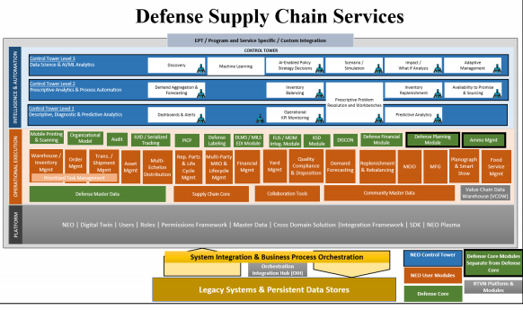 一个多语言的、具有外国军售(FMS)能力的、与供应和运输无关的解决方案通过我们的数字供应链网络™提供了一个 "SVOT"。它作为一个记录系统或参与系统运作,提供可操作的物流供应链可视性支持,以满足任务目标。结合断开的操作能力,该解决方案将提高军事行动的物流可视性。数字供应链网络™由ONE专有的AI/ML系统NEO驱动,是一个革命性的多方网络,是世界上第一个也是唯一的实时决策供应链套件。它使无限数量的贸易伙伴能够在网络上实时计划、执行、监控、同步和优化。该解决方案可以包容当前的系统,并优化它们的网络,以提高可视性和可操作性的协同作用。下图提供了数字供应链网络™功能的高层次视觉表现。