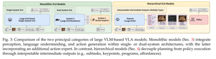 单系统模型 [26], [27], [44], [45] 在统一架构中集成了环境理解(包括视觉感知、语言理解与机器人状态感知)与动作生成。 * 双系统模型 [29]–[32] 则采用 VLM 作为场景解释的骨干网络,并由一个动作专家负责动作生成,二者通过潜在表示的传播进行信息交互。 * 分层式模型(Hierarchical Models)(图 3 右)[46]–[50] 明确将规划与策略执行解耦。它们区别于双系统的端到端方法,具有以下特征: