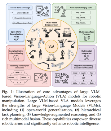 摘要—— 作为机器人学和具身智能的关键前沿,机器人操作需要精确的运动控制,以及在动态环境中对视觉与语义线索的综合理解。传统方法依赖预定义的任务规范和僵化的控制策略,往往难以在非结构化、全新场景下扩展或泛化。近年来,基于大规模视觉-语言模型(VLMs)的视觉-语言-动作(VLA)模型逐渐成为一种变革性的范式。这类模型利用大规模 VLMs 在开放世界泛化、层级任务规划、知识增强推理以及多模态融合方面的能力,使机器人能够理解高层指令、识别未知环境并执行复杂的操作任务。本综述首次从系统化、面向分类法的角度,对用于机器人操作的大规模 VLM 驱动 VLA 模型进行全面回顾。我们首先明确界定大规模 VLM 驱动的 VLA 模型,并划分出两类核心体系结构范式:(1)单体式模型,涵盖单系统与双系统设计,二者在集成程度上有所差异;(2)分层式模型,显式地通过可解释的中间表示将规划与执行解耦。在此基础上,我们深入探讨大规模 VLM 驱动的 VLA 模型:(1)其与强化学习、免训练优化、人类视频学习以及世界模型集成等前沿领域的结合;(2)其独特特征的综合,包括体系结构特点、操作优势,以及支撑其发展的数据集和基准;(3)未来的研究方向,包括记忆机制、四维感知、高效适应、多智能体协作以及其他新兴能力。本综述整合了近期进展,旨在弥合现有分类法的不一致性,缓解研究碎片化,并通过系统性地整合大规模 VLM 与机器人操作交叉领域的研究,填补关键空白。我们提供了一个定期更新的项目主页以记录最新进展:https://github.com/JiuTian-VL/Large VLM-based VLA for Robotic Manipulation。 关键词—— 视觉-语言-动作模型,机器人操作,具身智能,大规模视觉-语言模型