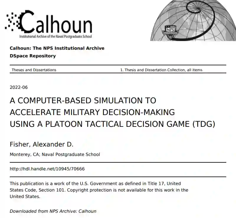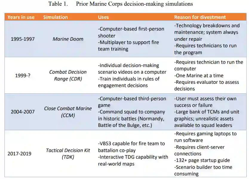 美海军陆战队长期以来一直使用战术决策游戏(TDG)来训练和评估领导和决策能力。使用纸笔或干擦板的陈旧过程需要一个主题专家在场,以评估和评价每个海军陆战队员的演习计划,并对他们的演习计划提供即时反馈。这个过程很耗时,而且不允许海军陆战队员进行必要的演练和集训,以建立他们在各种情况下的直觉决策并获得经验。无论任务如何,海军陆战队要求领导者在战斗中取得成功,要做好准备,即使是在第一次遇到这种情况时也要采取行动。