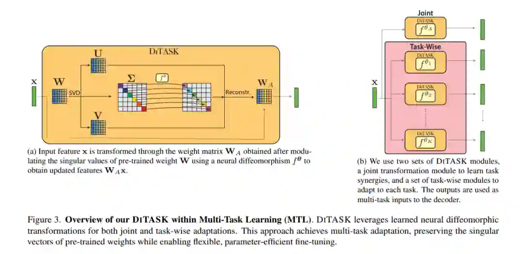 预训练的视觉Transformer(ViTs)已成为计算机视觉领域的强大工具。然而,如何高效地将其适应于多任务仍然是一个挑战,这源于需要在修改学习到的权重矩阵所编码的丰富隐藏表示的同时,避免任务之间的干扰。当前的高效参数方法(如LoRA)通过低秩更新迫使任务在受限的子空间内竞争,最终导致性能下降。我们提出了DITASK,这是一种新颖的微分同胚多任务微调方法,通过保留权重矩阵的奇异向量来维持预训练表示,同时通过奇异值的神经微分同胚变换实现任务特定的适应。通过这种方法,DITASK能够以最少的额外参数实现共享和任务特定的特征调制。我们的理论分析表明,DITASK在优化过程中实现了全秩更新,保留了预训练特征的几何结构,并为高效多任务学习(MTL)建立了新的范式。在PASCAL MTL和NYUD数据集上的实验表明,DITASK在四个密集预测任务中实现了最先进的性能,且使用的参数比现有方法少75%。我们的代码可在以下链接获取:[此处插入链接]。